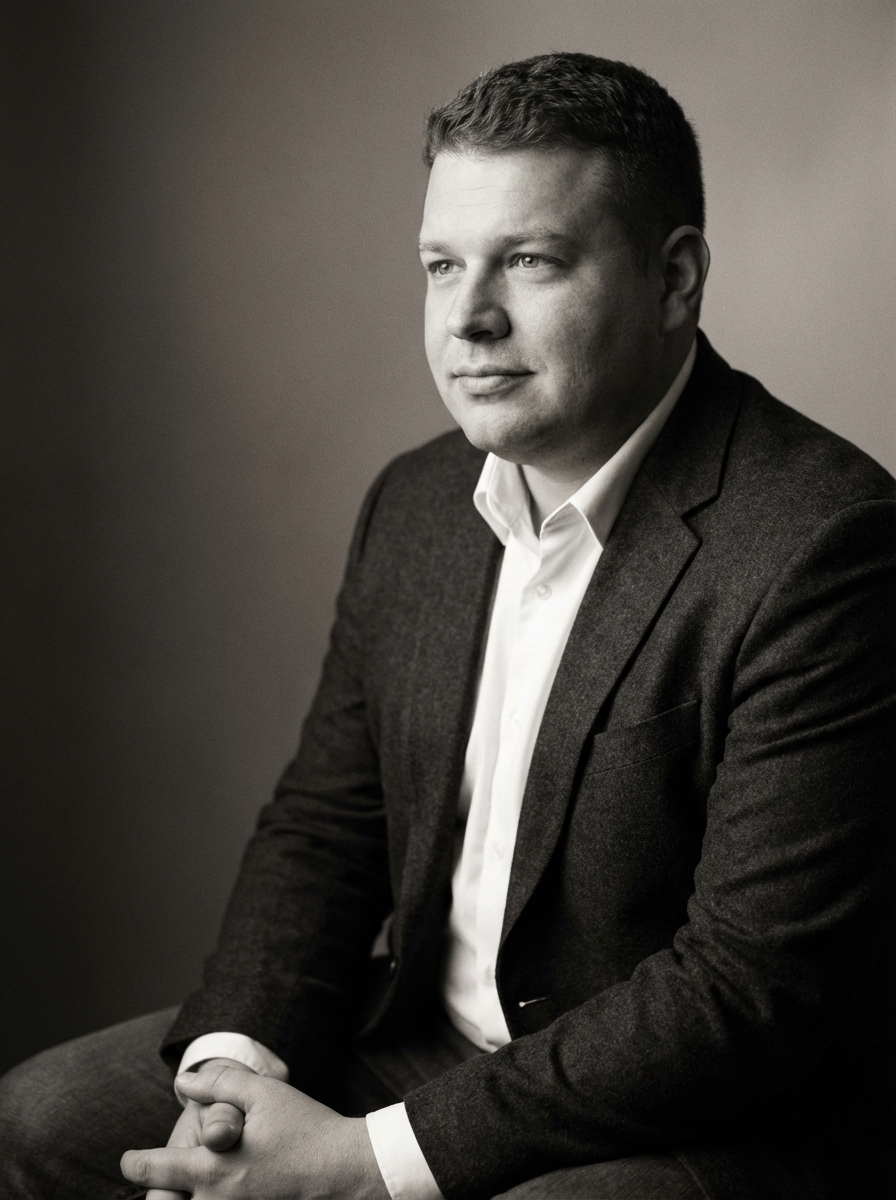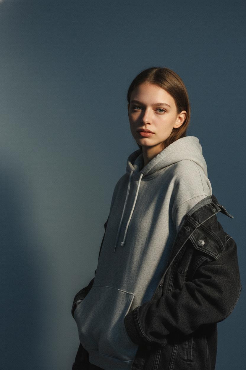 Premium studio-shot portrait with a quiet, profound mood, negative space, soft gradient background, and urban casual styling.