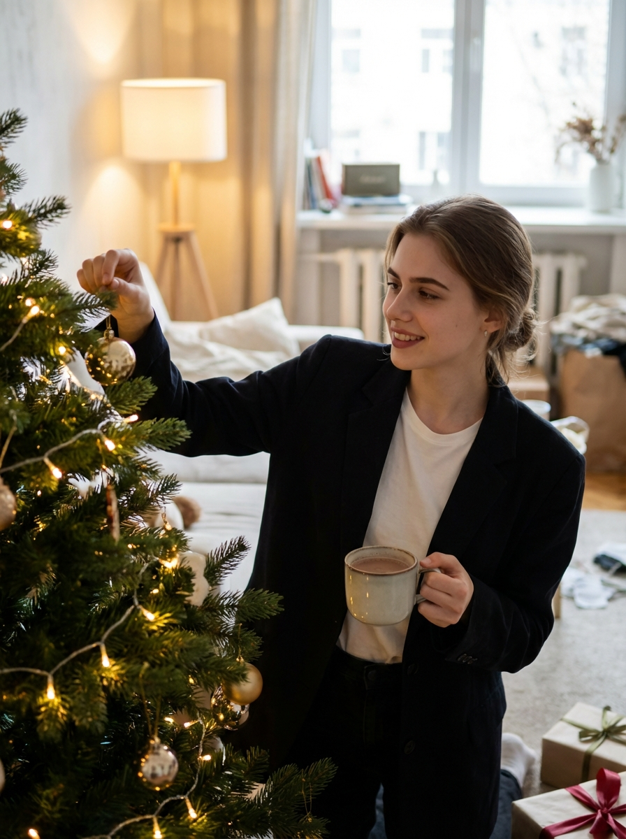 Cozy living room scene decorating a Christmas tree while holding a mug of hot cocoa, with warm fairy lights and wrapped gifts.