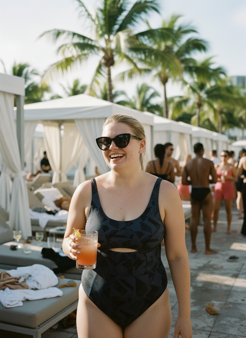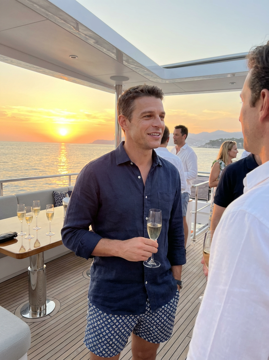 Model wearing shirt and swim shorts at an exclusive yacht party at sunset, capturing luxury and opulence.
