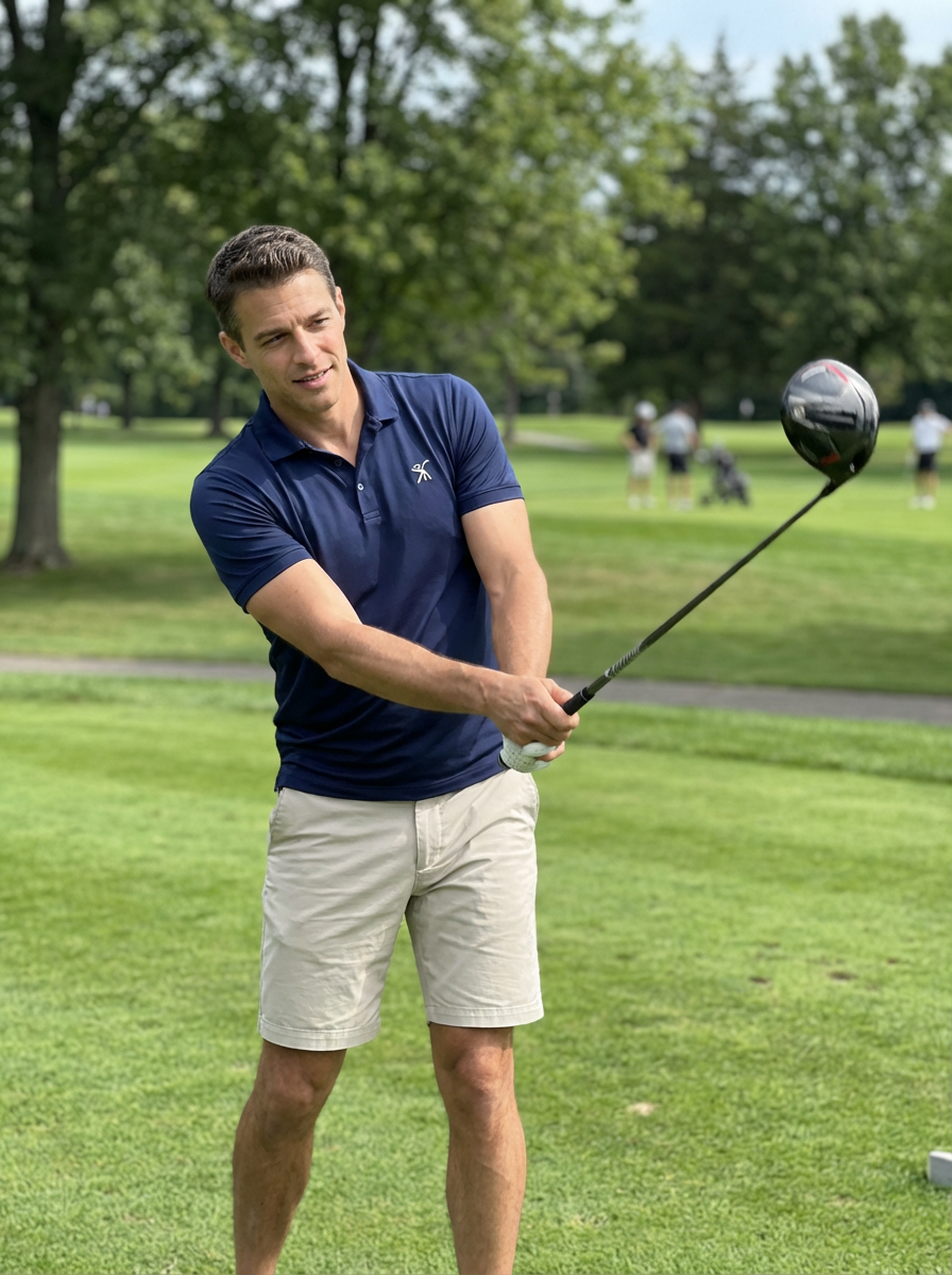 At the Grand Canyon rim wearing hiking shorts and a light jacket, with canyon views in the background.